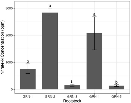 One-way analysis of variance (ANOVA) displaying average nitrate-nitrogen concentrations (ppm) of ungrafted GRN rootstocks at bloom during the 2022 growing season. Bars represent rootstock means, with error bars indicating the standard error of the mean (n = 3). Different letters above bars indicate significant differences among rootstocks based on a Fisher’s LSD test (p < 0.05).