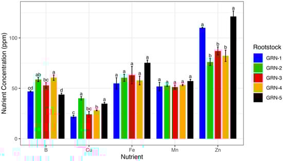 One-way analysis of variance (ANOVA) displaying average micronutrient concentrations (ppm) of ungrafted GRN rootstocks at bloom during the 2022 growing season. Bars represent rootstock means, with error bars indicating the standard error of the mean (n = 3). Different letters above bars indicate significant differences among rootstocks within each micronutrient based on a Fisher’s LSD test (p < 0.05).