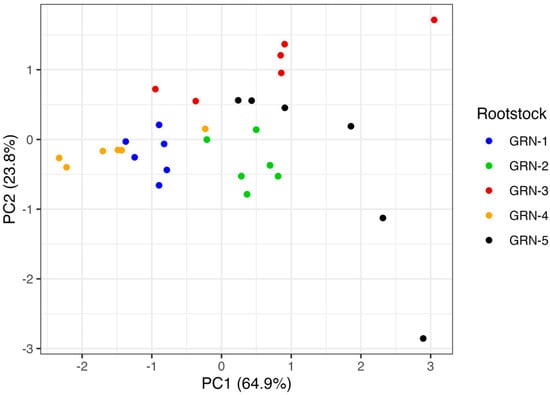 Principal component analysis (PCA) revealed that the first principal component (PC1) accounted for 64.9% of the total variation, while the second principal component (PC2) explained an additional 23.8% (Figure 6). PC1 was influenced by all three traits—internode length, internode diameter, and pruning weights—with internode diameter contributing the most (loading = 0.63). PC2 was primarily driven by pruning weights (loading = −0.79), with a moderate contribution from internode length. The PCA plot (Figure 6) displays the clustering of rootstocks along the first two principal components. GRN-1 and GRN-2 displayed tighter clustering compared to the other rootstocks. The other rootstocks, GRN-3, GRN-4, and GRN-5, showed partial clustering with data points that were more dispersed. Within PC1, GRN-1 and GRN-4 were positioned toward the negative axis, corresponding to smaller internode diameters, whereas GRN-2, GRN-3, and GRN-5 were located toward the positive end, indicating larger diameters.