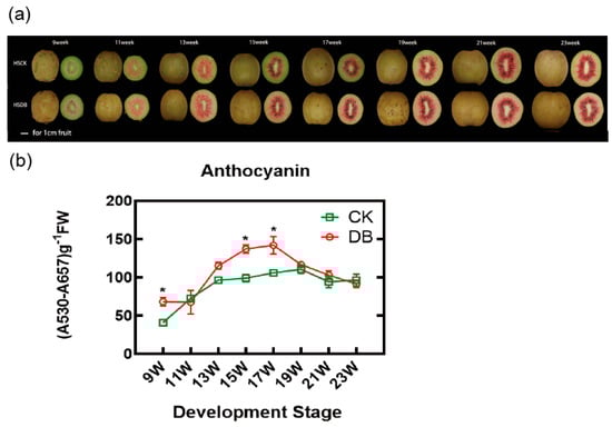 Color changes in kiwifruits in the control and bagged groups. (a) The color change stage of ‘Hongshi’ kiwifruit across eight different developmental stages following pollination: 9 weeks (9W), 11 weeks (11W), 13 weeks (13W), 15 weeks (15W), 17 weeks (17W), 19 weeks (19W), 21 weeks (21W), and 23 weeks (23W). (b) The anthocyanin content both in the control and bagged kiwifruit. A repeated-measures two-way ANOVA was conducted and significant differences were detected, LSD tests were applied for pairwise comparisons. A p value < 0.05 was considered statistically significant. LSD0.05 = 19.58 in (b). Asterisks indicate statistically significant differences between the control and bagged treatment group. The error bars in panels (b) represent the standard error (SE) of at least three biological replicates. “CK” indicates the control group and “DB” indicates the double-bagged treatment group in the figure.