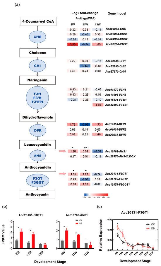 To further investigate the molecular mechanisms underlying anthocyanin accumulation in kiwifruit under bagging treatment, RNA high-throughput sequencing (RNA-seq) was performed. The previous results in Section 3.1 above showed that bagging treatment increases anthocyanin content during the color-changing stages. We analyzed all anthocyanin biosynthesis genes in kiwifruit according to [38] (Figure 2a). The RNA-seq result revealed that only two structure genes, ANS1 (Acc16762) and F3GT1 (Acc20131), exhibited differential expression across two growth stages (Figure 2b). Further analysis revealed that the expression (FPKM) of ANS1 was less than 3 (Figure 2b), whereas its homologous gene ANS4, which has been reported to be involved in kiwifruit anthocyanin accumulation [39], had an expression higher than 200 (Figure A1). Hence, ANS1 is not the key gene contributing to anthocyanin accumulation under bagging treatment. As for F3GT1, which has been reported to be involved in anthocyanin accumulation in kiwifruit inner pericarp [37], its expression was significantly higher in bagged kiwifruit, particularly at 9W and 11W. Therefore, F3GT1 was selected for further analysis.