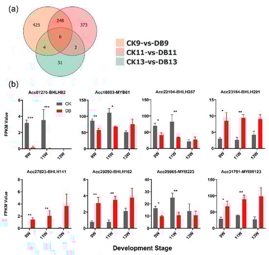 The identification of candidate differentially expressed TFs. (a) A Venn diagram of differentially expressed genes (DEGs) between the control and bagging treatment groups in three developmental stages. (b) The FPKM value of the eight differentially expressed TFs. Unpaired t-tests were applied to compare the control and treatment groups at each time point. Asterisks indicate significant differences between the two groups (* p < 0.05; ** p < 0.01; *** p < 0.001). Error bars represent the SE of three biological replicates.