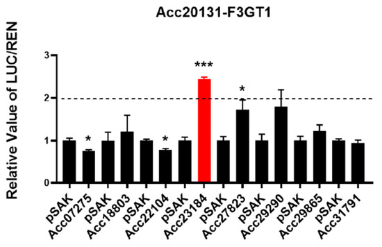 In order to study the regulatory mechanism of the eight candidate TFs, the full coding sequences of TFs and the promoter of F3GT1 were inserted into the pSAK277 and pGREEN 0800 LUC vectors, respectively. A dual-luciferase assay was carried out to test the regulatory effects of the TFs on the F3GT1 promoter (Figure 4). We found that bHLH291 significantly activated the F3GT1 promoter, and promoter activity was increased to 2.45-fold (Figure 4). Nevertheless, MYB transcription factors MYB61, MYB223, and MYBR123 did not show any obvious activation or repression effects on the F3GT1 promoter.