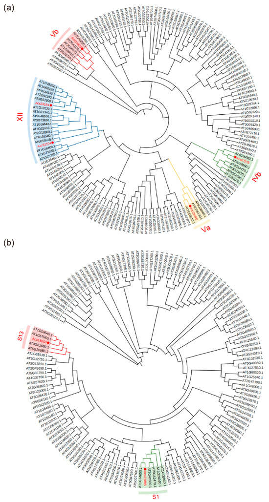 A phylogenetic tree of bHLH genes revealed that five kiwifruit bHLH genes belong to IVb, Va, Vb and XII subgroups [44]. Among these, bHLH141 (Acc27823) belongs to the Vb subfamily, bHLH82 (Acc07275) to IVb, and bHLH162 (Acc29290) to Va. Additionally, bHLH287 (Acc22104) and bHLH291 (Acc23184) are members of the XII subfamily (Figure 5a). We found that these five bHLH members are not homologous to TT8, EGL3 and GL3 [45,46], which are involved in anthocyanin metabolism [47]. A phylogenetic tree of MYB revealed that MYB223 (Acc29865) belongs to subgroup S1 [48], which is associated with MYB30, a regulator known to inhibit sucrose-induced anthocyanin biosynthesis in Arabidopsis seedlings [49]. In addition, MYB61 (Acc18803) is part of subgroup S13, which typically includes MYB86 which is involved in the metabolic regulation of anthocyanins in plants [50]. Moreover, MYB61 of Paphiopedilum hirsutissimum may regulate structural genes involved in flower color formation [48]. MYBR123 (Acc31791) was not included in the phylogenetic tree because it does not belong to the R2R3-MYB family (Figure 5b).