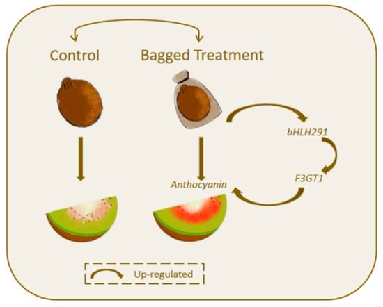A schematic model of bagging-promoted anthocyanin accumulation in kiwifruit. Bagging treatment promotes the expression of bHLH291, which subsequently activates F3GT1 expression and enhances anthocyanin accumulation in the inner flesh.