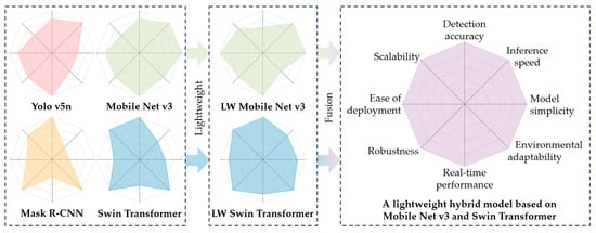 As shown in Figure 1, this study systematically evaluates mainstream models for agricultural pest and disease detection across dimensions such as lightweight design, accuracy, real-time processing, and deployment compatibility using a radar chart. By including lightweight variants like MobileNetV3 and Swin Transformer, the analysis provides a comprehensive benchmark. Building on these insights, we propose AgriLiteNet (Lightweight Networks for Agriculture), an innovative lightweight object detection model designed for real-time, high-precision detection of tomato pests and diseases on resource-constrained edge devices. AgriLiteNet employs a dual-branch architecture that synergistically integrates an optimized MobileNetV3 CNN branch for capturing local features and a streamlined Swin Transformer branch for modeling global context. It further enhances performance with a lightweight channel–spatial mixed attention module (L-CSMA) for effective feature fusion and a lightweight feature pyramid network (L-FPN) to strengthen multi-scale feature representation, enabling robust detection of small targets like spider mites, densely clustered targets like bacterial spot, and large targets such as late blight under complex field conditions.