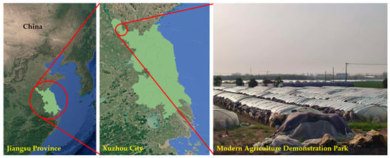 To enhance dataset diversity and improve the model’s generalization capabilities, additional images were captured at the Modern Agricultural Park in Xuzhou City, Jiangsu Province, China (38°36′14.58″ N, 118°02′41.94″ E), as shown in Figure 2. This park cultivates several tomato varieties, including Jinpeng No. 8, Zhongza No. 9, and Cherry Tomato. Image acquisition took place primarily between March and April, encompassing various growth stages of the tomato plants. A Redmi K30 smartphone camera, manufactured by Xiaomi Technology Co., Ltd., Beijing, China, was used for image collection. The camera was mounted on a tripod and positioned 0.1 m from the tomato foliage to ensure stability and consistency during data acquisition.