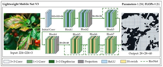 MobileNetV3, tailored for deployment on resource-constrained devices, incorporates depthwise separable convolutions, inverted residuals, and linear bottlenecks to minimize computational overhead while preserving strong feature extraction capabilities [23]. The integration of the h-swish activation function further enhances its operational efficiency. With optimizations for high-resolution imagery, MobileNetV3 meets the precision requirements of agricultural robots without compromising real-time performance. Its computational efficiency is formally described in Equation (3).
