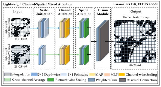 As shown in Figure 7, the L-CSMA module receives local feature maps from the lightweight MobileNetV3 and global feature maps from the lightweight Swin Transformer. Depthwise separable convolutions unify the channel dimension to 64, and nearest-neighbor interpolation adjusts the spatial resolution to 28 × 28, resolving scale mismatches. The channel attention mechanism computes channel statistics via global average pooling (GAP) and MLP to generate channel weights, recalibrating the feature map to emphasize critical information. Subsequently, the spatial attention mechanism compresses the feature map into a single-channel spatial map through cross-channel averaging, applying depthwise separable convolutions to extract spatial dependencies and generate spatial weights, which are multiplied element-wise with the input features to optimize spatial distribution. The processed features are fused through weighted summation, with fusion weights dynamically adjusted by learned adaptive parameters, and a residual connection mitigates information loss. This hierarchical processing ensures effective integration of local and global features while maintaining computational efficiency.