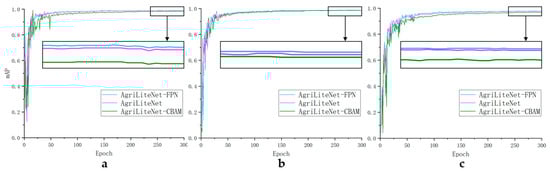 The mAP trends of AgriLiteNet and its variants over 300 epochs for (a) small objects, (b) large objects, and (c) dense objects.