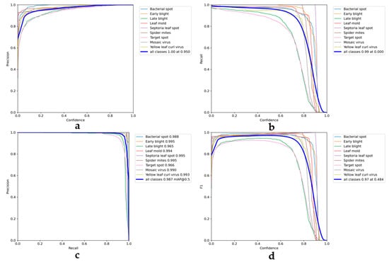 Figure 12 shows the relationships among Confidence, Precision, Recall, and F1 score during training. Confidence exhibited a positive correlation with mAP@0.5, indicating increasing detection certainty as feature learning progressed. The Recall curve rose more rapidly than Precision in the early stages, while Precision improved significantly in later stages, reflecting better classification accuracy over time. The F1 score stabilized above 0.90, indicating a strong balance between Precision and Recall. For small targets such as spider mites (mAP@0.5 = 0.9750) and dense targets such as bacterial spot (mAP@0.5 = 0.9900), the F1 score exceeded 0.92, demonstrating the model’s multi-scale optimization capability.