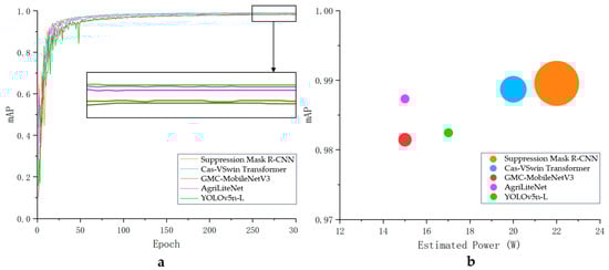 Figure 13 presents the results based on a test set of 1200 images, approximately 100 per category. Panel (a) shows the mAP@0.5 variation across epochs. Panel (b) compares mAP@0.5 and power consumption, with dot sizes representing model sizes. Suppression Mask R-CNN achieved the highest mAP@0.5 of 0.98955, with 0.99555 on late blight and 0.99206 on Yellow Leaf Curl Disease. Cas-VSwin Transformer achieved an mAP@0.5 of 0.47, including 0.49247 on Mosaic Disease. AgriLiteNet recorded an mAP@0.5 of 0.98735, including 0.9900 on bacterial spot, 0.9874 on late blight, and 0.9750 on spider mites. YOLOv5n and GMC-MobileV3 both achieved an mAP@0.5 of 0.47, with 0.47 on Mosaic Disease. Panel (b) shows that AgriLiteNet has 2.0 million parameters and 0.608 GFLOPs, compared to 44.5 million and 4.8 GFLOPs for Suppression Mask R-CNN, and 30.0 million and 3.2 GFLOPs for Cas-VSwin Transformer. AgriLiteNet runs at 35 frames per second, with a power consumption of 15 watts. YOLOv5s achieves 37 FPS with 16 watts. Compared to YOLOv5n and GMC-MobileV3, AgriLiteNet offers slightly higher computational cost with approximately 0.005 improvement in mAP@0.5.