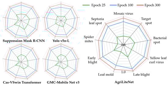 The classification performance of AgriLiteNet was evaluated across nine tomato pest and disease categories, comparing it with baseline models: Suppression Mask R-CNN [27], Cas-VSwin Transformer [28], YOLOv5n [29], and GMC-MobileV3 [30]. Confusion matrices were generated at the 300th epoch, and the mean average precision at an intersection-over-union threshold of 0.5, denoted mAP@0.5, was tracked at the 25th, 100th, and 300th epochs. All models were trained with consistent data augmentation and optimization settings.