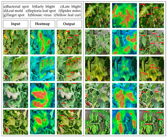 The detection capabilities of AgriLiteNet across nine tomato pest and disease categories were visualized using input images, heatmaps, and output detection maps, as shown in Figure 16. These visualizations were generated based on a test set of approximately 1000 images, with around 100 samples per category. The input images highlight the distinctive visual characteristics of each pest and disease, including dense black spots of bacterial spot, ring-shaped lesions of early blight, necrotic patches of late blight, green mold of leaf mold, water-soaked lesions of septoria leaf spot, yellow speckles of spider mites, bullseye lesions of target spot, striations of Mosaic Disease, and curled leaves of Yellow Leaf Curl Disease. Heatmaps, generated using Gradient-weighted Class Activation Mapping (Grad-CAM), highlight the regions the model focuses on [31]. The heatmaps for target spot and early blight concentrate on lesion centers, while bacterial spot and septoria leaf spot show dense activation points. Mosaic Disease exhibits uniform activation across striated regions, indicating effective global feature extraction. Heatmaps for late blight, leaf mold, and spider mites accurately cover critical areas. The output detection maps include bounding boxes, class labels, and Confidence scores. Mosaic Disease achieves a Confidence score of 0.99, with clear delineation of the affected areas. Target spot and early blight lesions are enclosed with Confidence scores between 0.93 and 0.99. Bacterial spot and septoria leaf spot maps display multiple bounding boxes with scores from 0.96 to 0.99, with minor misses due to background interference. Yellow Leaf Curl Disease and late blight are detected with Confidence scores of 0.99 and 0.98, respectively. Leaf mold and spider mites show slight bounding box deviations but maintain Confidence above 0.93. These results indicate that AgriLiteNet can accurately locate and identify various types of pest and disease targets, demonstrating strong multi-scale detection capabilities.