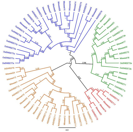 The protein sequences of Arabidopsis AtSWEET and rice OsSWEET were downloaded from the Pfam [37] protein family database (http://Pfam.sanger.ac.uk/, accessed on 17 October 2024). The sequences were aligned using the mafft v7.313 software, and the phylogenetic tree of the gene family was constructed using the FastTree v2.1.11 (http://www.microbesonline.org/fasttree/, accessed on 17 October 2024) with default parameters (bootstrap 1000) [44,45]. The gene family was categorized into four major groups represented by the colors blue for G1, green for G2, red for G3, and orange for G4.