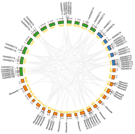 Chromosomal localization of mango, rice, and Arabidopsis SWEET genes and covariance analysis between their gene families. Red represents mango chromosomes, green represents rice chromosomes, blue represents Arabidopsis chromosomes.