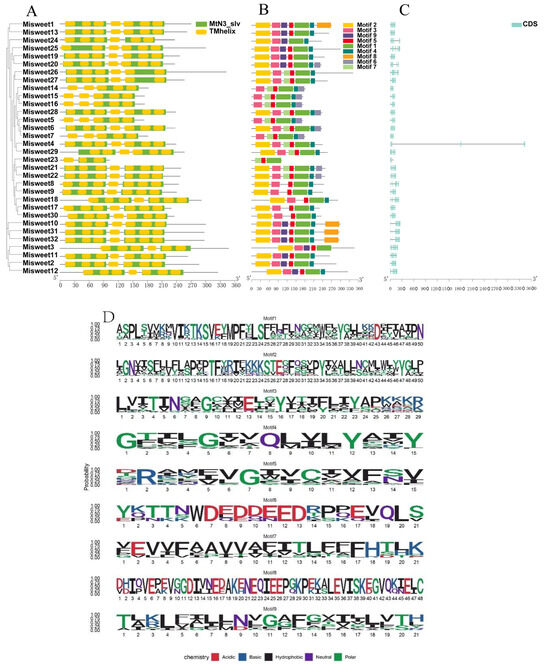 Conserved motifs and exon-intron structure analysis of the SWEET family in mango. (A) Conservative domain of SWEET gene family in mango; (B) conserved domain analysis of SWEET gene family in mango; (C) gene structure map of SWEET gene family in mango; (D) logo of conserved motif of SWEET gene family in mango.