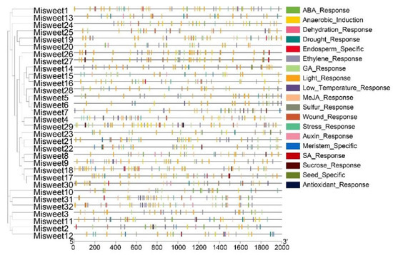 To investigate the potential functions of the 32 mango SWEET genes, a cis-element analysis was conducted on the promoter regions of these genes. A total of 19 major cis-elements were identified within the mango SWEET genes (Figure 4). The 32 mango SWEET genes contained a wealth of light-responsive elements, as well as development-related elements associated with meristem formation, endosperm-specific expression, and seed development. Additionally, various hormone-responsive elements were identified, including those for gibberellins, abscisic acid, ethylene, auxins, salicylic acid, and methyl jasmonate. Furthermore, stress-responsive elements were found in the mango SWEET gene promoters, which respond to drought, low temperature, and damage. These findings indicated that the mango SWEET genes possess diverse functions, participating in sugar transportation, plant hormone responses, various abiotic stress responses, and growth and development processes.