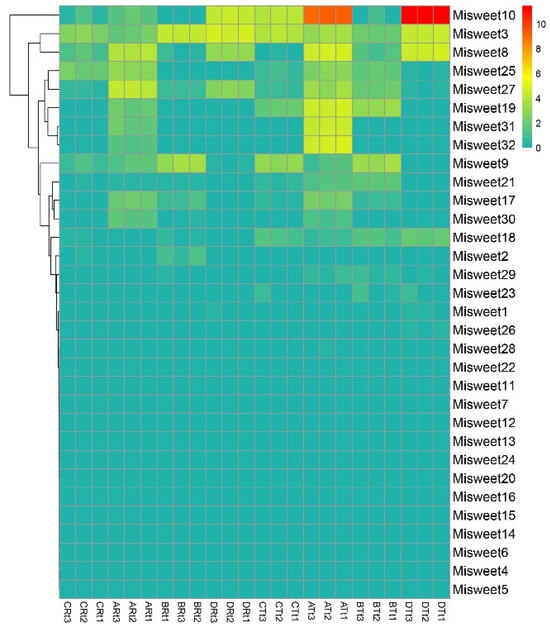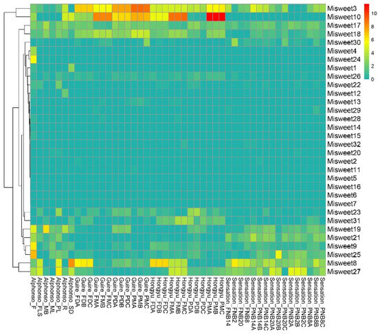 To further analyze the expression characteristics of SWEET genes at different developmental stages of mango fruit, this study analyzed the transcriptomic sequencing data of mango fruits at the juvenile stage, fruit expansion stage, green mature stage, and fully ripe stage for two different varieties, ‘Tainong 1’ and ‘Renong 1’. The results (Figure 5) show that 13 genes were not expressed in the fruits, while the expression levels of the remaining 19 genes varied significantly between different varieties and developmental stages. Among the two mango varieties, ‘Tainong 1’ and ‘Renong 1’, the genes Misweet3, Misweet8 and Misweet10 exhibited higher expression levels at the fully ripe stage (D). Some genes, such as Misweet3, Misweet8, Misweet9, Misweet10, Misweet17, Misweet19, Misweet25, Misweet27, Misweet30, Misweet31, and Misweet32 showed higher expression levels at the juvenile stage (A). The expression levels of Misweet8 and Misweet10 in both mango varieties followed a pattern of decreasing and then increasing during fruit development. Additionally, in ‘Renong 1’, the expression patterns of certain SWEET genes were notably different from those in ‘Tainong 1’. For instance, Misweet27 had lower expression levels at the fully ripe stage (D) in ‘Tainong 1’, but it displayed higher expression levels in ‘Renong 1’. Based on the transcriptomic sequencing data of SWEET genes from different mango varieties, including Alphonso, Guire, Hongyu and Sensation, the expression levels of SWEET genes in various mango varieties were analyzed. The results (Figure 6) indicated that Misweet3, Misweet8, Misweet9, Misweet10, Misweet17, Misweet18, Misweet19, Misweet21, Misweet23, Misweet25, Misweet27, and Misweet31 exhibited different degrees of expression among different mango varieties. Misweet3, Misweet10, Misweet17, and Misweet18 had higher expression levels in the Guire and Hongyu varieties. Misweet8, Misweet25, and Misweet27 had higher expression levels in the Alphonso and Sensation varieties. Thirteen mango SWEET genes were either not expressed or exhibited very low expression levels, which is consistent with the transcriptomic data from ‘Tainong 1’ and ‘Renong 1’.