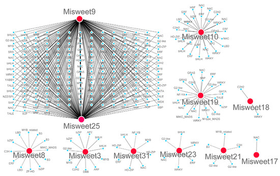 Based on Figure 7, Misweet3, Misweet8, Misweet9, Misweet10, Misweet17, Misweet18, Misweet19, Misweet21, Misweet23, Misweet25, Misweet27, and Misweet31 exhibited high expression levels in various mango varieties. Therefore, we further predicted and analyzed the transcription factors regulating these 12 mango SWEET genes and constructed a network diagram of the transcription factors. The results showed that Misweet9 and Misweet25 were the most regulated by transcription factors and were interconnected. Misweet10 and Misweet19 followed closely behind, while Misweet17 and Misweet18 were less regulated. A relatively high number of transcription factors, including ERF, NAC, WRKY, MYB and C2H2, were identified.
