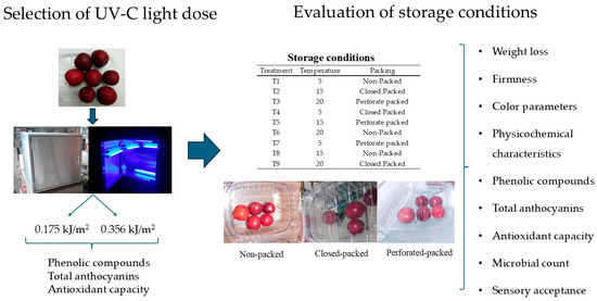 According to the author’s knowledge, the use of UV-C light as a pretreatment to induce the synthesis of antioxidant compounds and its effect on the quality attributes of plums during storage have not been explored. Therefore, this study aimed to evaluate the effect of UV-C light on the bioactive compounds and antioxidant capacity of plums, as well as the impact of storage conditions on their quality attributes.