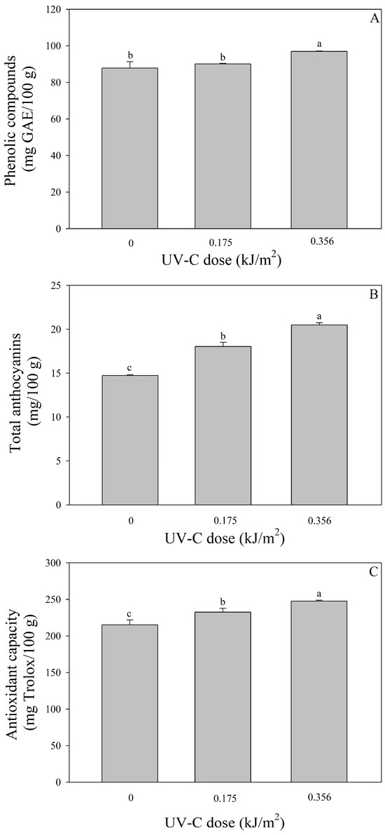 Effect of ultraviolet-C light on phenolic compounds (A), total anthocyanins (B), and antioxidant capacity (C) of plums. Bars in figures indicate standard deviation. Different letters a, b, and c indicate statistical differences (p < 0.05).