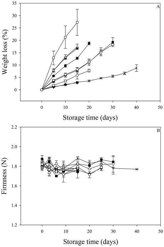 Weight loss (A) and firmness (B) of plums stored under different conditions. ■ T1, ♦ T2, ▲ T3, × T4, ● T5, □ T6, ◊ T7, ∆ T8, and ○ T9. Bars in figures indicate standard deviation.