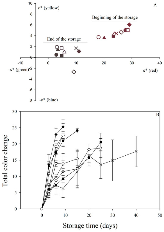 Change in a* and b* color parameters (A) at the beginning and end of the storage and total color change (B) in plums during storage under different conditions. ■ T1, ♦ T2, ▲ T3, × T4, ● T5, □ T6, ◊ T7, ∆ T8, and ○ T9. Bars in (B) indicate standard deviation.