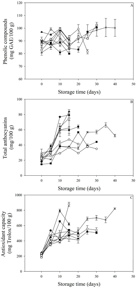 The phenolic compounds (A), total anthocyanins (B), and antioxidant capacity (C) of plums stored under different conditions. ■ T1, ♦ T2, ▲ T3, × T4, ● T5, □ T6, ◊ T7, ∆ T8, and ○ T9. Bars in the Figures indicate standard deviation.