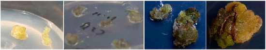 - Nwite, P.A.; Eke, C.; Osemwegie, Q.; Ikhajiagbe, B. Assessment of media modification and induction of calli on coconut (Cocos nucifera L.) palm explants. Res. J. Agric. Sci. 2023, 11, 33–39. Available online: https://www.researchgate.net/publication/371609345 (accessed on 21 April 2025).