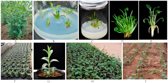 The regeneration pathway of de novo organogenesis in Atractylodes lancea. Images (A–I) showing the A. lancea plants, apical bud explants, primary culture, multiple cultures, root culture, the adaptation of tissue-cultured A. lancea plants, transplant of tissue culture seedling, raising seedlings in the green room, and field transplantation of A. lancea. (A) A. lancea plant (mother plant); (B) Establishment of sterile culture (apical shoot explant); (C) Proliferation culture; (D) Clustered shoots; (E) Rooted plantlets in vitro; (F) Acclimatization (lid-opening hardening); (G) Tray acclimatization; (H) Transplanting of tissue-cultured plantlets; (I) Field planting of tissue-cultured plants.