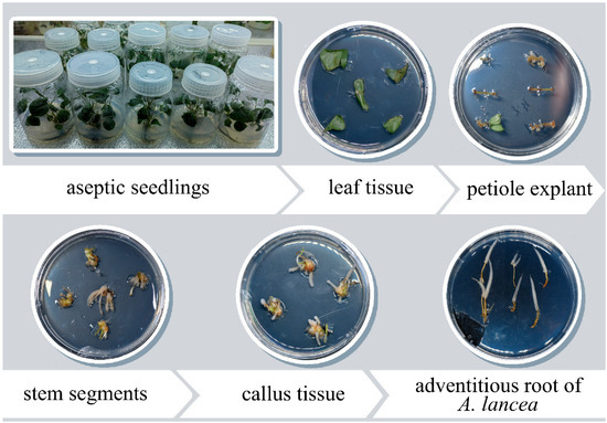 Atractylodes lancea (Thunb.) DC is a perennial herbaceous plant belonging to the genus Atractylodes in the Asteraceae family, which is endemic to East Asia and widely distributed in China. A. lancea plants cultivated in the Maoshan region of Jiangsu are Dao-di herbs with the best quality [1]. A. lancea exerts the effects of drying dampness and strengthening the spleen, expelling wind and removing cold, and improving vision [2]. Modern pharmacological experiments have proved that Atractylodes rhizomes exhibit hepatoprotective, hypoglycemic, diuretic, and antihypoxic effects. The primary substance basis for its pharmacological effects is the presence of volatile oils, including atractylodin, atractylon, β-eudesmol, and hinesol [3]. In recent years, the reserves of wild A. lancea resources have declined significantly owing to habitat alterations and increases in market demand. Wild resources of Mao-A. lancea are endangered because of excessive excavation, a low seed-set rate, poor resistance to adversity, etc. According to the list of key protected wild plants in Jiangsu Province (first batch), as one of the four endangered medicinal plants under key protection in Jiangsu Province, there has been no collection or purchase of commercial medicinal materials in the past 40 years [4]. A. lancea can be propagated via tuber transplantation or direct seeding. Artificial cultivation is an effective way to protect and utilize the resources of A. lancea. However, a key issue is the severe shortage of seedling sources [5]. The application of tissue culture technology for rapidly propagating rare and endangered medicinal plants can overcome several problems in seed germination and the disadvantage of variety degeneration in conventional asexual reproduction [6,7].