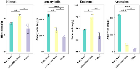 Quantitative determination of essential oils in embryogenic calli, hairy root, and adventitious root of Atractylodes lancea. The samples were processed as described in the Materials and Methods section, and the amounts of the four noted essential oils were quantified by GC-MS. The values are displayed as means ± SD (n = 3). * p < 0.05, ** p < 0.01, *** p < 0.001. Concentration profiles of four volatile essential oils (atractylodin, atractylon, hinesol, and β-eudesmol) across three plant tissues: calli, hairy root, and adventitious root. Data points (dots): Represent individual biological replicates; Error bars: Indicate standard deviation (±SD) of biological replicates, reflecting natural variability among samples.