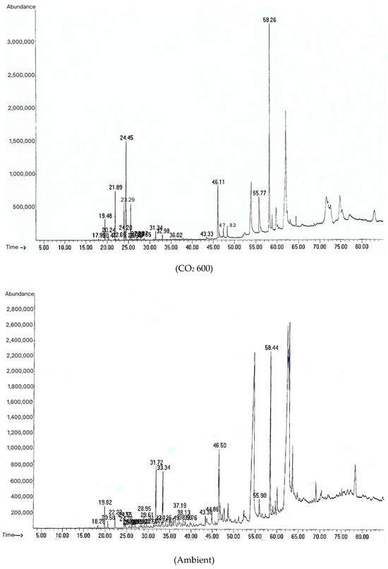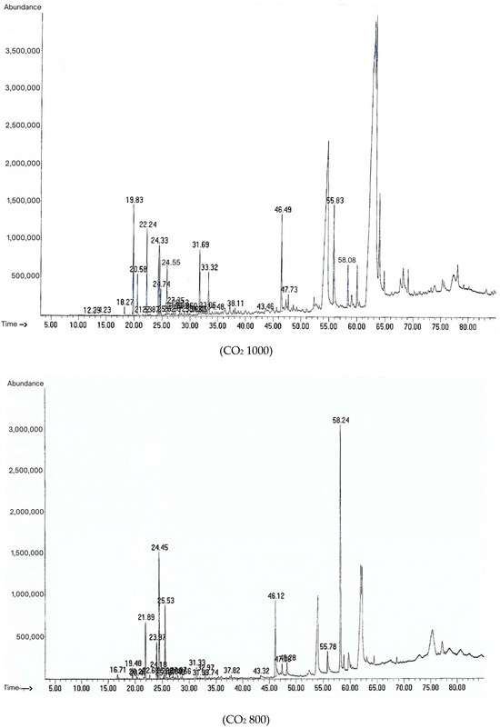 Visual comparison of the chromatographic profiles reveals CO2-dependent patterns in metabolite accumulation. The 1000 ppm CO2 treatment (CO2 1000) displays the highest overall peak intensities, particularly in the 18–35 min region, where sesquiterpene compounds elute. The 800 ppm treatment (CO2 800) shows a distinctive prominent peak at approximately 24.45 min, representing enhanced germacrene D production, while maintaining moderate intensities for other compounds. The 600 ppm treatment (CO2 600) exhibits an intermediate profile with balanced peak distribution throughout the chromatogram.