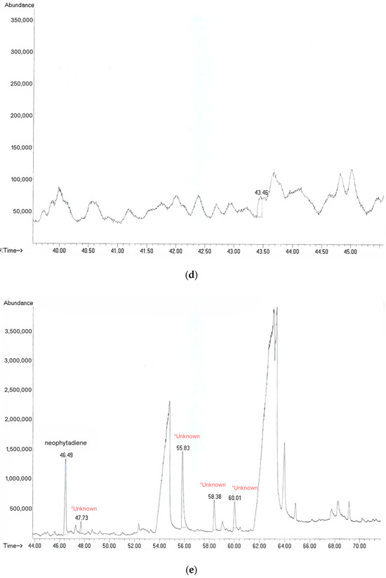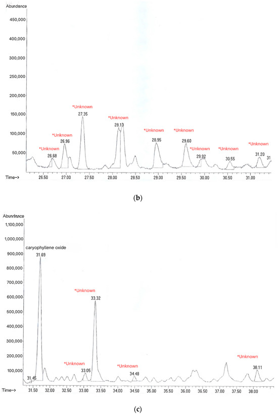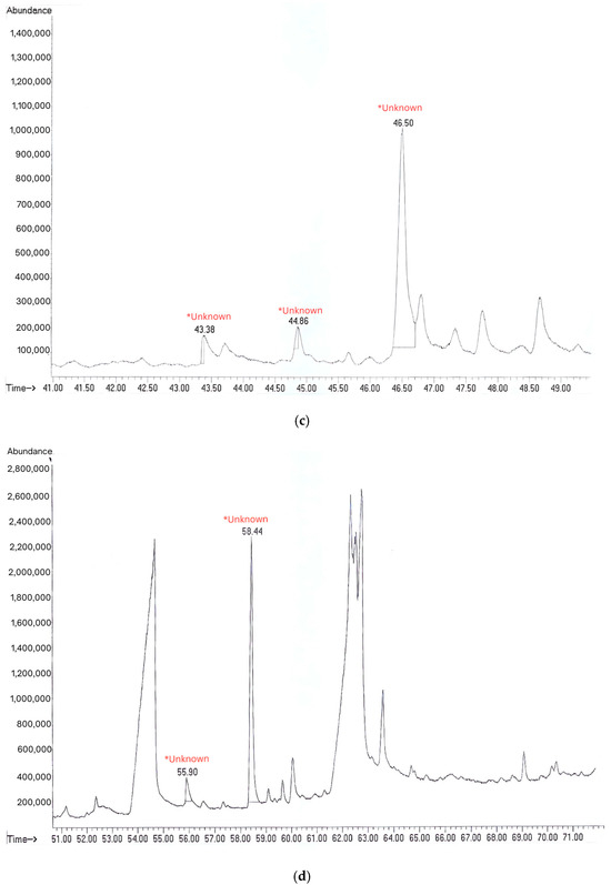 Mass spectrometry was performed using an Agilent 6890N GC coupled with a 5973 MSD (Agilent Technologies, Santa Clara, CA, USA) with electron ionization (EI) mode at 70 eV. Mass spectra were recorded over the range of m/z 35–550 amu at a scan rate of 2.76 scans/s. The interface and ion source temperatures were maintained at 280 °C and 230 °C, respectively. The analysis was conducted at Central Laboratory (Thailand) Co., Ltd., Bangkok, Thailand.