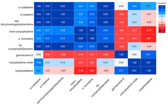2 and independent regulatory mechanisms; and (3) compounds favored under ambient conditions (red vectors), including caryophyllene oxide and neophytadiene, exhibiting negative loadings on both components (−0.55 to −0.72) and indicating inverse relationships with CO