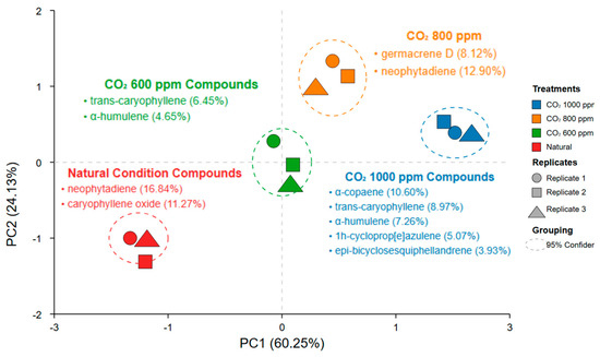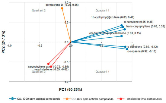 trans-caryophyllene, showing strong positive PC1 loadings (0.83–0.92) and coordinated biosynthetic regulation; (2) germacrene D (orange vector) with unique PC2 loading (0.85), reflecting peak accumulation at 800 ppm CO