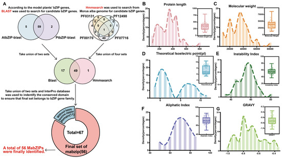 Sequence identification process and physicochemical properties of MabZIP genes. (A) Workflow to identify candidate genes. (B–G) Prediction of (B) protein length, (C) molecular wight, (D) theoretical isoelectric point, (E) instability index, (F) aliphatic index, and (G) grand average of hydropathicity (GRAVY) of the identified MabZIP proteins.