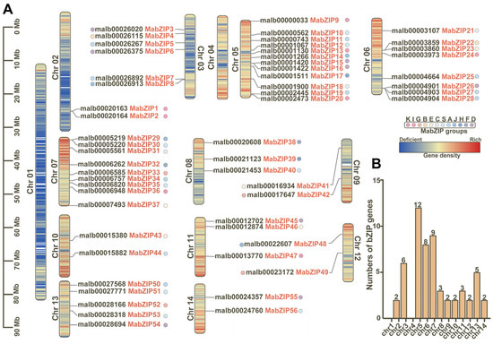 The location of genes on chromosomes may affect their function and expression level. We visualized the chromosome distribution of the MabZIP genes and found that the 56 MabZIP genes are unevenly distributed on the 12 chromosomes (Figure 2A). The number of genes on each chromosome is irrelevant to chromosome size. For example, Chr02 is larger than Chr05, but Chr05 contains more MabZIP genes than Chr02. Chr01 and Chr04 do not have MabZIP genes. We named these MabZIP genes based on their locations on chromosomes.