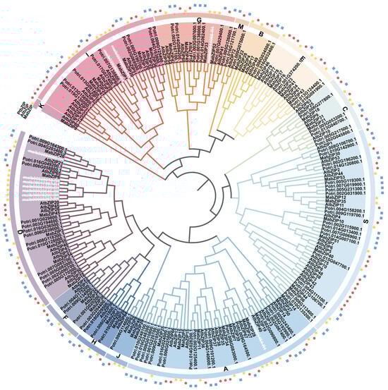 In total, we identified 56 bZIP-containing proteins in mulberry. Although the overall gene count in the mulberry genome is higher than that in Arabidopsis [38], the number of bZIP genes is slightly lower compared to analyzed angiosperm species, such as 78 in Arabidopsis [4], 86 in poplar [5], and 77 in Tobacco [74]. Interestingly, eleven proteins in mulberry are homologous to bZIP in Arabidopsis and poplar [4,5] but lack of the canonical bZIP domain (Figure 1), suggesting potential domain loss or divergence. The evolutionary and adaptive significance of these proteins in mulberry awaits further investigation. All 56 identified mulberry bZIP proteins possess the canonical bZIP domain, characterized by a conserved basic region for DNA binding and a leucine zipper motif for dimerization, indicating their conserved roles across angiosperms. Based on sequence similarity, these bZIP proteins can be grouped into 12 distinct clades. Comparative analysis revealed that, unlike Arabidopsis, the PtbZIP family lacks members in group K, while mulberry retains a group K homolog but lacks members in group M. This suggests possible functional redundancy or evolutionary divergence in these lineages.