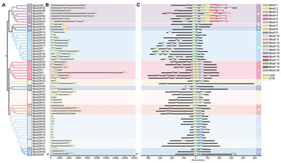 Phylogenetic analysis, conserved motifs and structural features of MabZIP genes. (A) Phylogenetic tree of MabZIP genes. The MabZIP genes are grouped and named consistent to phylogenetic clades in Figure 3. Blocks and branches of different colors denote different groups of MabZIP genes. (B) The structural features of MabZIP genes. Exons, introns and 5′UTR/3′UTR are presented by green boxes, line segment, and yellow boxes, respectively. (C) Conserved motifs of MabZIP genes. Twenty distinct conserved motifs are represented by different colored boxes. Detailed information about the motifs is listed in Table S2.