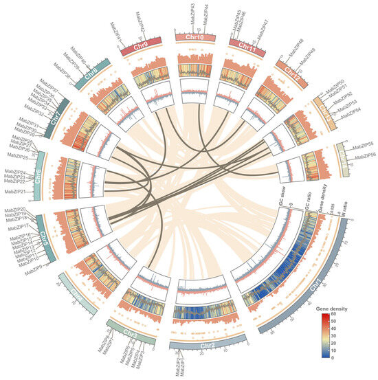 Chromosomal collinearity of bZIP genes in Morus alba. Rectangles of different colors represent chromosomes (Chr1–14). From the outer to inner of the plot: yellow, hollow circle for N-ratio distribution, orange bar and heatmap for gene density, overlapped gray line for GC ratio, blue and pink line for GC skew. The light brown curves in the background indicate syntenic gene pairs in Morus alba genome, while the dark brown curves indicate syntenic MabZIP gene pairs.