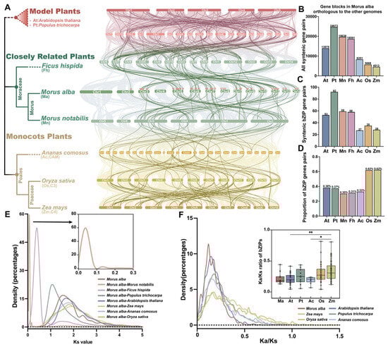 Syntenic and evolutionary analysis of Morus alba and seven other plants. (A) Syntenic analysis of Arabidopsis thaliana (At), Populus trichocarpa (Pt), Ficus hispida (Fh), Morus alba (Ma), Morus notabilis (Mn), Ananas comosus (Ac), Oryza sativa (Os), and Zea mays (Zm). Total syntenic gene pairs (B) and bZIP-specific syntenic pairs (C) between Morus alba and seven plants. (D) Percentage of bZIP syntenic pairs relative to total syntenic pairs. (E) Distribution of Ks of collinearity genes from Morus alba genome and orthologous gene pairs between Morus alba and other seven plants. (F) Distribution of Ka/Ks ratio of syntenic gene pairs in six plants and the ratio of bZIP gene Ka/Ks (* p < 0.05, ** p < 0.01, Student’s t-test).