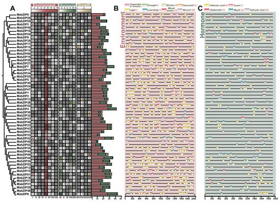 Cis-acting element analysis of MabZIP genes. (A) Distribution of cis-acting elements in the 2 kb promoter regions of MabZIP genes. Elements are classified into 3 functional categories (environmental stress, hormone response, and growth/development) and 17 subcategories (Table S5). Different colors and the numbers in the cells represent the quantity of corresponding subcategories and the bar on the right counts the quantity of three categories. (B,C) Category, quantity, and position of environment or hormone element in promoter regions of MabZIP genes.