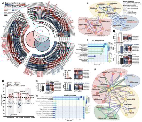Expression profiles of MabZIP genes under various abiotic stress conditions, protein–protein interaction (PPI) networks, and gene ontology (GO) enrichment analyses. (A) Circos plot showing expression profiles of MabZIP genes under heat stress, salt–alkaline stress, and high light stress. Gene labels in bold red or blue indicate significantly up- or down-regulated genes, respectively. The Venn plot in the middle reveals the differential expression gene (DEG) sets and their overlaps for heat stress (red), salt–alkaline stress (blue), and high light stress (white). (B) Differential expression summary of all MabZIP genes across the three abiotic stresses. Student’s t-test was applied. p value < 0.05 is indicated in red or blue, while p value ≥ 0.05 is indicated in gray. Dark red or blue indicate |log2FC|≥ 1. (C) PPI network of MabZIP43, which is divided into three clusters. Circles indicate MabZIP43 interaction proteins. The gene ID of their homologs in Arabidopsis are also displayed in orange color. (D) Bar chart depicting the expression level of MabZIP43 (left) and heatmap of DEGs predicted to interact with MabZIP43 (right) (* p < 0.05, ** p < 0.01, **** p < 0.0001, Student’s t-test). (E) GO enrichment analysis of all proteins in the MabZIP43 PPI network. (F) PPI network of MabZIP24 divided into four clusters. (G) Bar chart showing the expression level of MabZIP24 (left) and heatmap for DEGs predicted to interact with MabZIP24 (right) (** p < 0.01, *** p < 0.001, Student’s t-test). (H) GO enrichment analysis of all proteins in the MabZIP24 PPI network.
