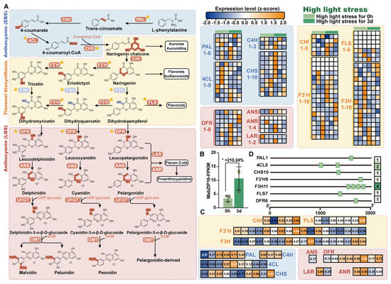 Anthocyanin accumulation, commonly triggered by abiotic stresses such as high light, heat, and cold stresses, protects plants by absorbing excess light and provides antioxidant capacity in many plant species [29,33,69]. After high light stress, the juvenile leaves of mulberry seeding displayed a noticeable purple and red phenotype. To identify MabZIPs involved anthocyanin biosynthesis, we performed a co-expression analysis of MabZIP genes with anthocyanin biosynthesis structure genes. We identified 91 genes encoding 12 different enzymes involved in the anthocyanin biosynthetic pathway in genome of Morus alba by using “find best homology” in TBtools (Figure 9A; Table S7) [51]. Among these, two genes were strongly up-regulated and six genes displayed decreased expression in the juvenile leaves after high light treatment for three days.