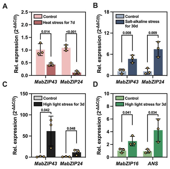 Relative expression level of candidate genes under heat, salt–alkaline and high light stress based on qRT-PCR. MabZIP43 and 24 expression level under (A) heat, (B) salt–alkaline, and (C) high light stress. (D) MabZIP16 and ANS expression level of mulberry juvenile leaves under high light stress. Changes in gene expression were calculated using the 2−ΔΔCt method with MaACTIN as the reference gene and are expressed relative to control group. Each treatment contains three biological replicates. The statistical significance of differences in target genes relative expression was analyzed between treated groups and control group using Student’s t-test. Values are means ± standard deviations (n = 3), and the p values are shown.