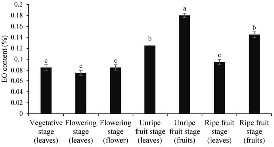 The lack of significant differences in EO content among leaves at different phenological stages (vegetative, flowering, and ripe fruits) and flowers at the flowering stage implies that EO biosynthesis in these organs remains relatively stable throughout plant development. However, the lowest EO percentage recorded in leaves during the flowering stage (0.07%) suggests a possible resource allocation shift, where the plant prioritizes EO production in flowers or fruits rather than leaves during this critical reproductive phase. Overall, the higher EO content in fruits compared to other plant organs emphasizes the importance of fruits as major sites of EO biosynthesis and storage (Figure 2).