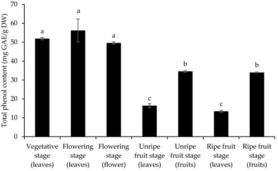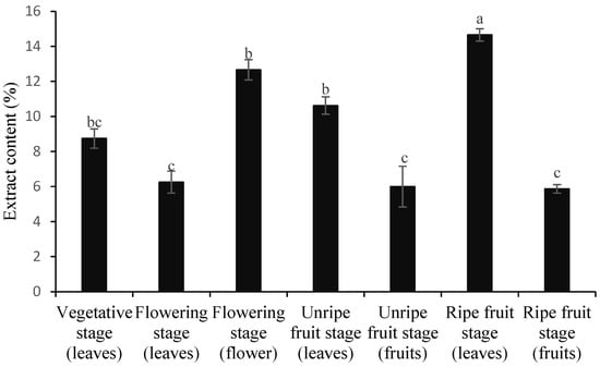 Figure 3 shows the significant variation in extract content between different organs and phenological stages. The highest extract yield was observed in leaves during the ripe fruit stage (14.65%), followed by flowers during the flowering stage (12.66%). The extract content was significantly lower in fruits (both ripe and unripe) and leaves during the flowering stage, with no statistically significant differences observed between these samples.