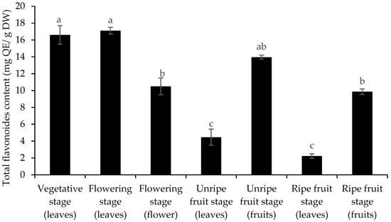 Changes in total flavonoid content of C. spinosa organs at different phenological stages. Means (columns) and standard errors (vertical bars) of three replicates are depicted. Columns with different letters were significantly different at p < 0.05 (Duncan’s test).